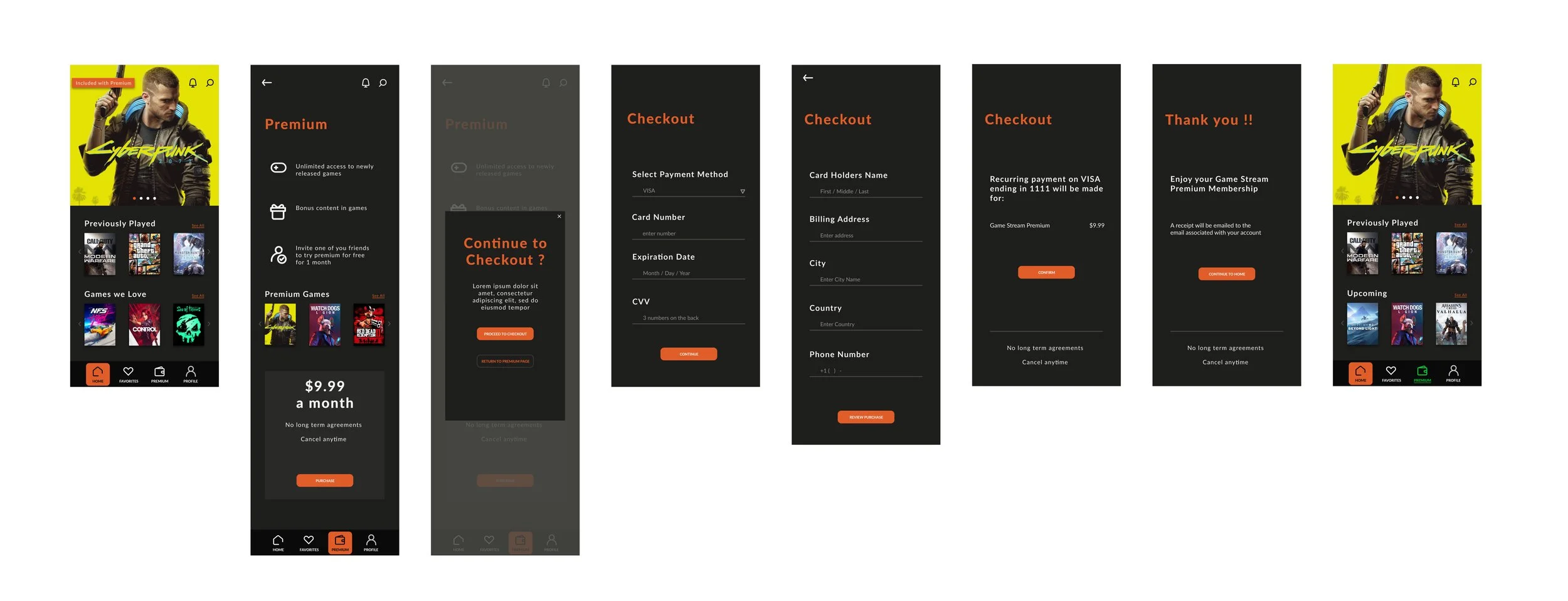 Once we have all of the feedback from our testing it is time to iterate on the designs and create a high fidelity version of our wireframes. With our high fidelity wireframes we fixed all of the issues from testing and made the app look much more appealing. Down below you will see all of our high fidelity designs for the Game Stream premium sign up process.